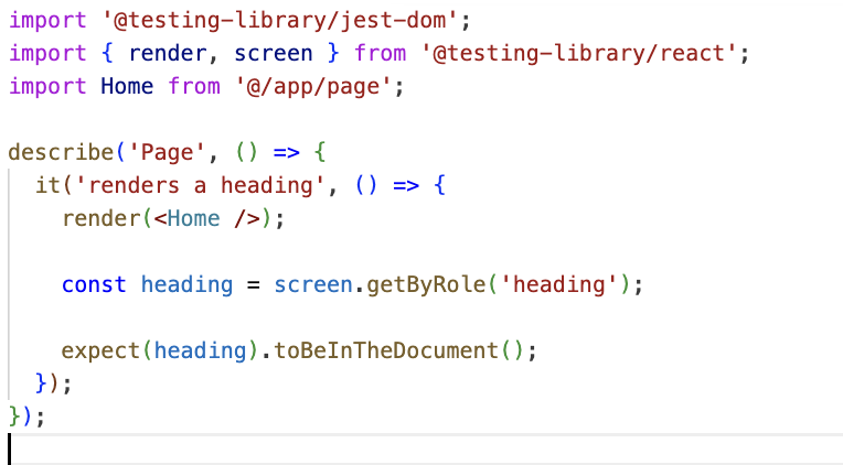 heading이라는 역할을 가진 요소가 Home 컴포넌트에 있는지 확인하는 간단한 테스트를 작성했다.