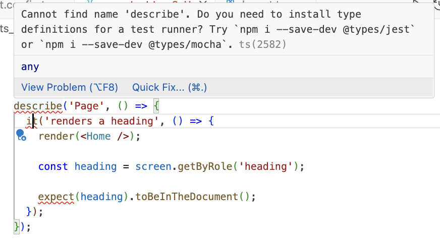 하지만 describe, it, expect 사용 할 때 에러가 발생했다. 이 오류는 Typescript가 Jest의 전역 테스트 함수(describe, it, expect)를 인식하지 못해서 발생하는 문제로 Jest의 타입 정의 패키지를 설치해주어야 한다.